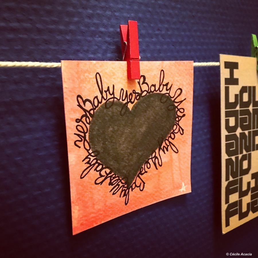 Parfois elle dépose aussi des petites cartes, simplement suspendues au bout d’une branche d’arbre ou sur un fil. Si vous en croisez une, n’hésitez pas. Vous pouvez la prendre et la garder en souvenir. C’est un cadeau qu’Adelsa Bugey vous fait. Elle m’en a offert une pour que je la ramène dans ma home sweet home.