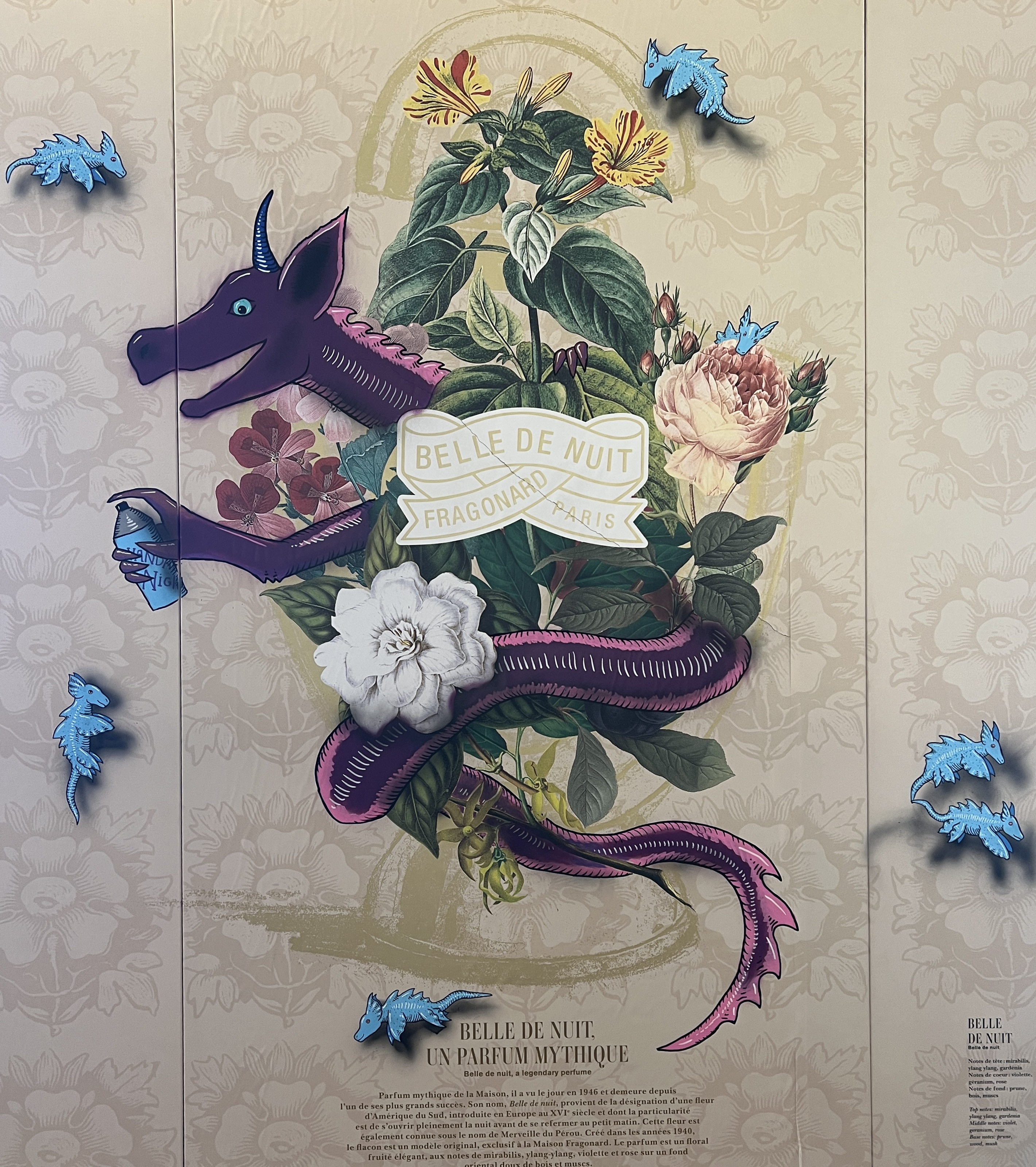 Le parfum et le street art partagent une caractéristique essentielle : leur fugacité. Les parfums s’évaporent dans l’air, tandis que les œuvres de street art disparaissent des murs au fil du temps. Codex Urbanus, tout comme un alchimiste des odeurs, utilise la biodiversité de notre planète pour créer des créatures fantastiques tout aussi uniques et envoûtantes que les fragrances. Il était donc tout naturel que les parfums complexes de Fragonard rencontrent ces chimères composites pour un ballet improbable où les odeurs délicates se mêlent aux élytres et aux tentacules des créatures.